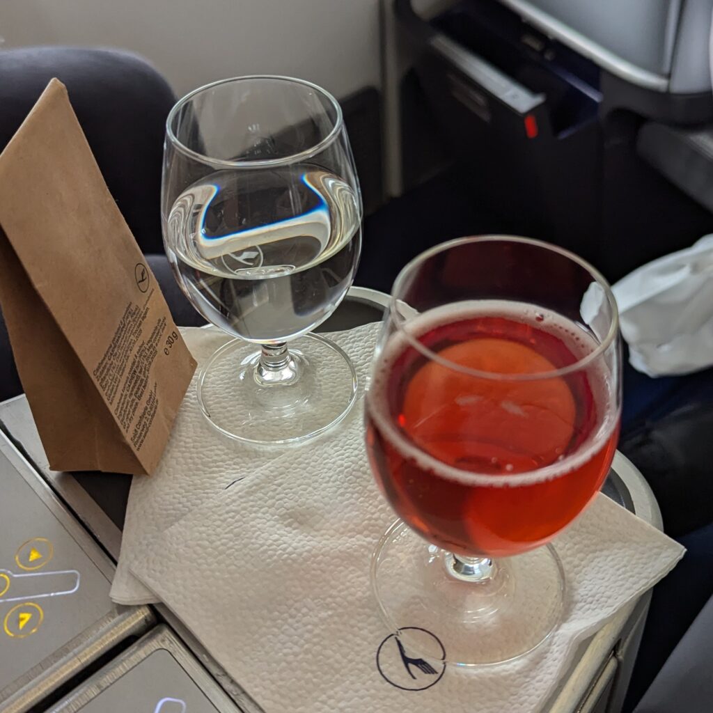 Unsere Plätze waren jedenfalls sehr gut. Wir wurden empfangen mit einer kleinen Auswahl aus Wasser, Sekt und dem Avionic, einem ’süßen‘ Cocktail mit Campari.