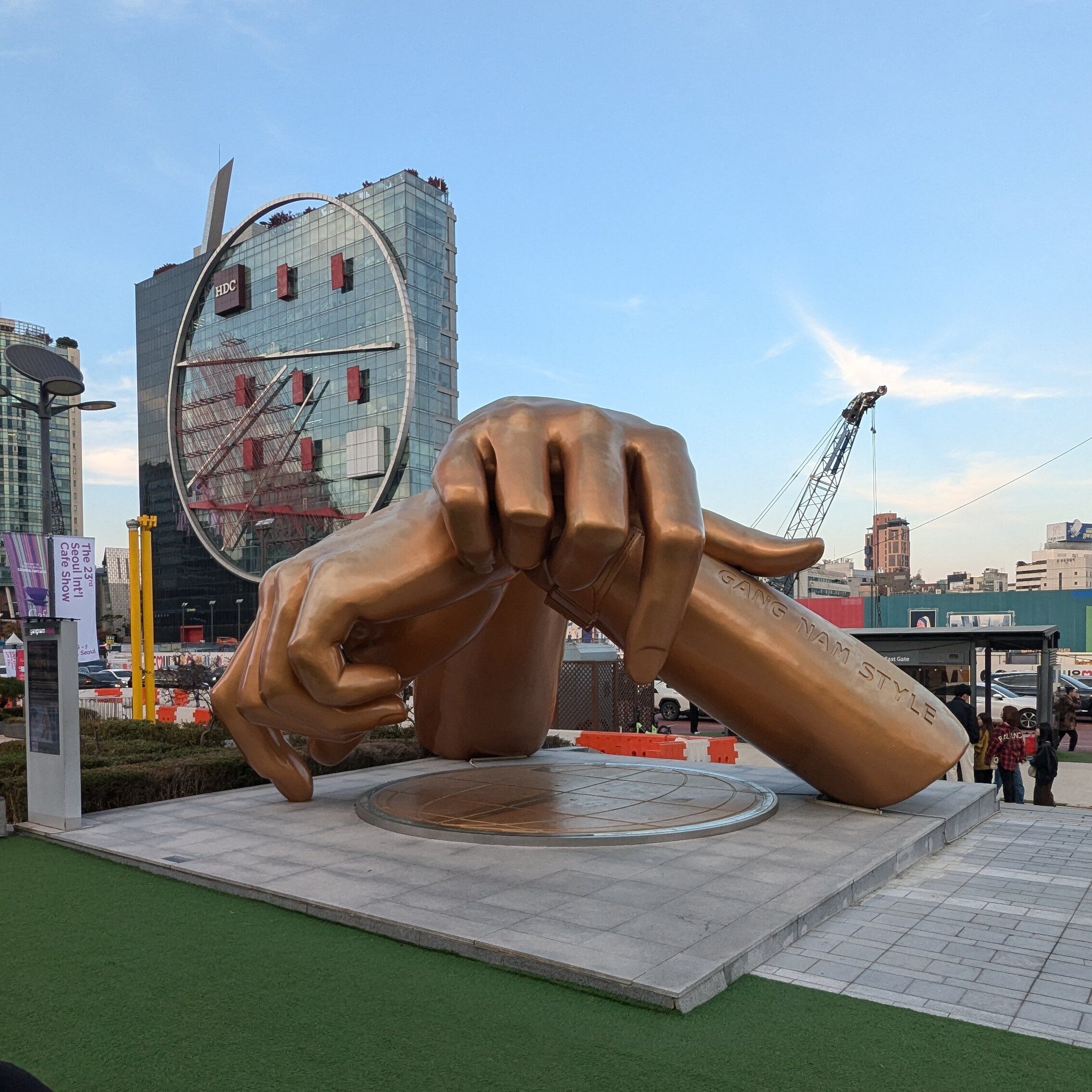 Dort besuchten wir die sogenannte Coex-Mall, was in erster Linie eben eine Mall ist. Sie hat aber mindestens zwei Besonderheiten. Zum Einen findet sich an einem der Eingänge eine übergroße Nachbildung der Hände die Gangnam(’s Style) in der ganzen Welt berühmt gemacht haben.