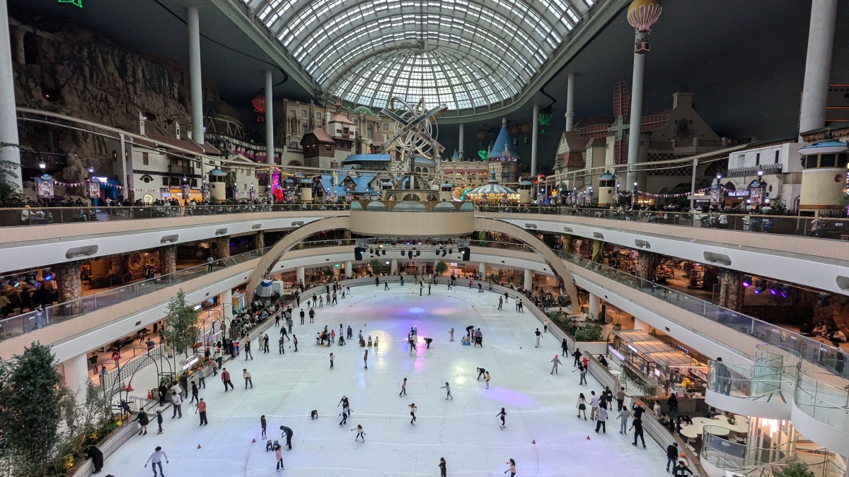 In Zentrum ist eine große Eislaufläche. Neben Freunden und Pärchen gab es auch kleine Trainingsgruppen, die Eiskunstlauf und Skating geübt haben. Auf den drei Stockwerken drumherum fand man dann eine Menge an Essensangebot und natürlich Attraktionen.