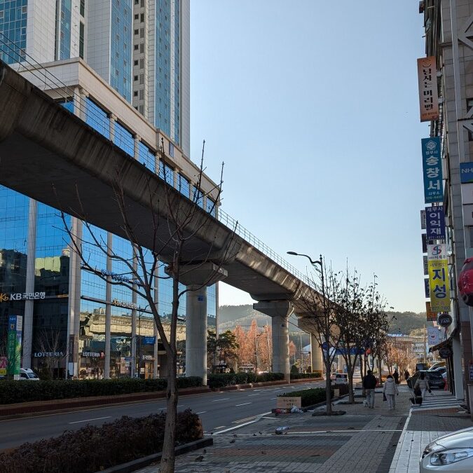 Ansonsten stach die Stadt noch durch eine Besonderheit hervor. Sie hat eine oberirdische Stadtbahn. Diese schlängelt sich zwischen den Hochhäusern hindurch, aber bietet an manchen Stellen auch einen tollen Blick über die Stadt und den Fluss.