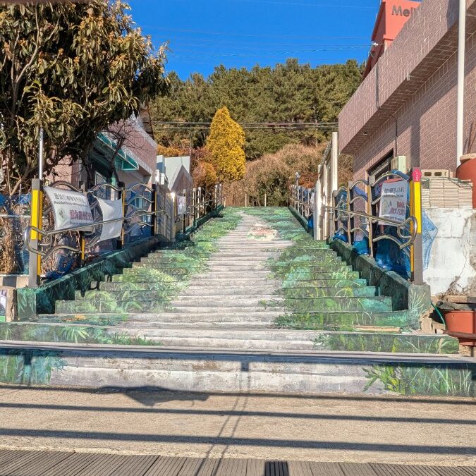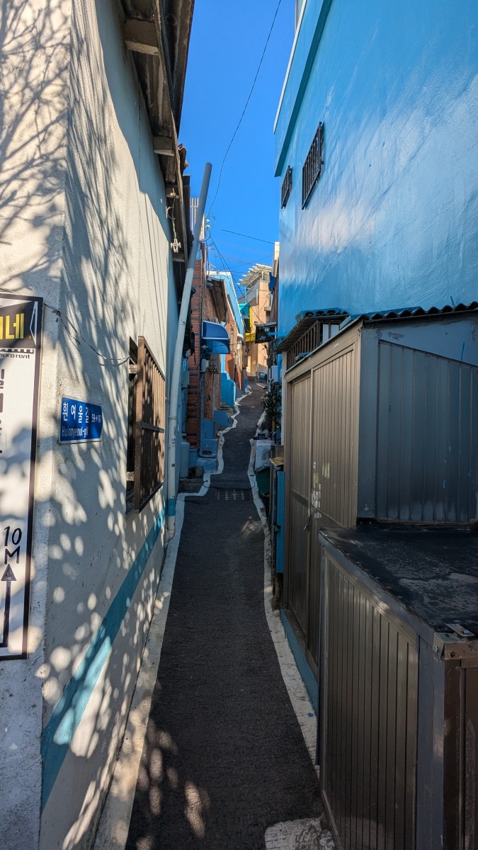 Das zweite alte Dorf zieht sich entlang der Küste. Huinnyeoul wurde hauptsächlich von Kriegsgeflüchteten gegründet. Auf 2-3 Kilometer Länge kann man immer mit Blick auf das Meer entweder entlang der Häuser entlangspazieren (und unterwegs Essen, Trinken und Andenken kaufen) oder direkt am Meer einer Promenade folgen. Diese endet bei einem Tunnel durch die steile Küstenkante. Leider war beides aktuell gesperrt. Aber auch konnte man wieder den krassen Kontrast zwischen modernen Apartments und einfachen Wohnhäusern sehen. Manche von ihnen hatten kleine Gärten oder Anpflanzungen vor der Eingängen und viele kleine Gassen führen zu versteckten Terrassen. Alles in allem sehr schön und sehr entspannend. Schade war nur, dass eben nicht alles aktuell zugänglich war.